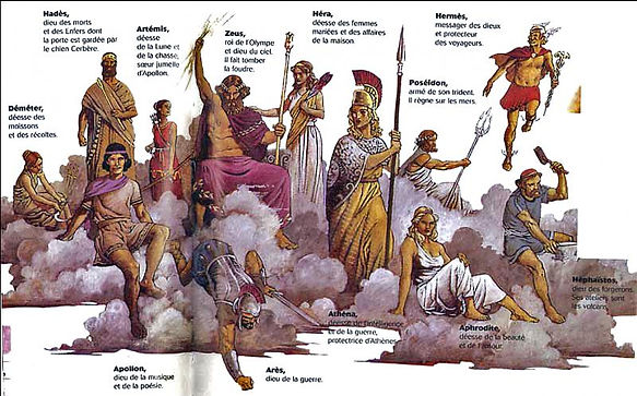 Enfin, une troisième génération dont les dieux régnaient sur le Mont Olympe (au nord de la Grèce). Au départ le Panthéon (édifice religieux) était composé des enfants de Chronos ; Zeus (maitre de l’Olympe, dieu suprême du Ciel qui peut faire abattre sa foudre sur les humains lorsqu’il est en colère), Poséidon (dieu de la mer), Hadès (dieu des enfers), Hestia (dieu du foyer), Déméter (déesse de l’agriculture), Héra (déesse de la femme et du mariage).